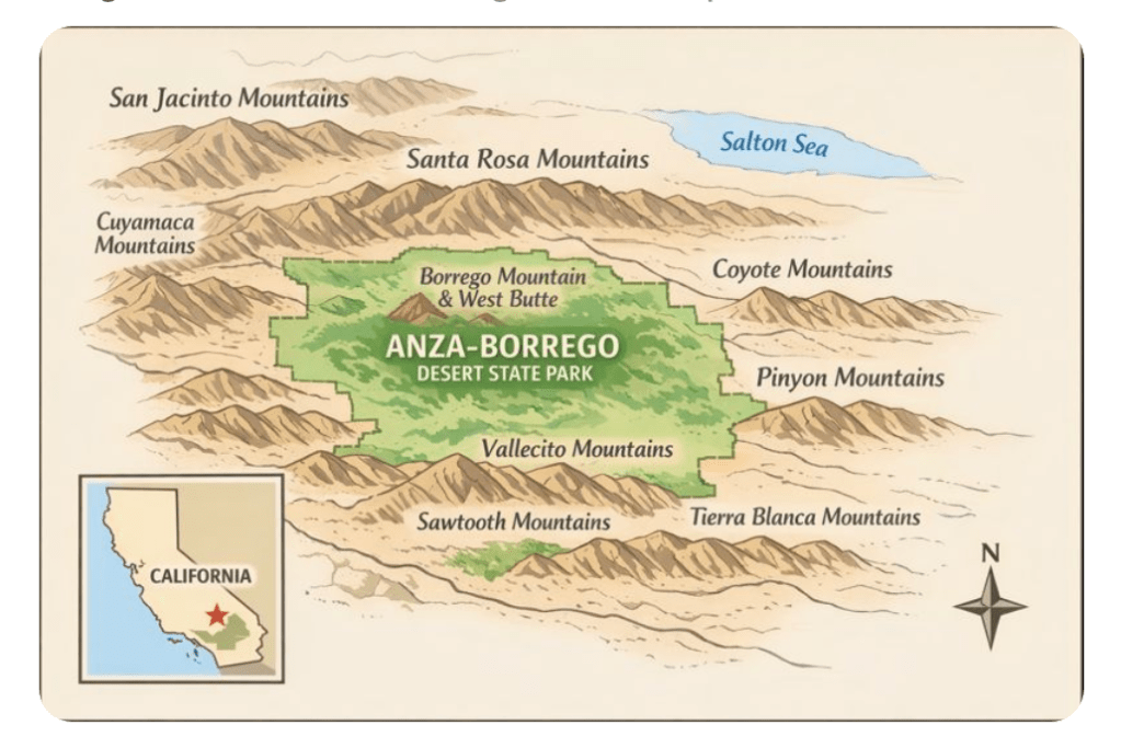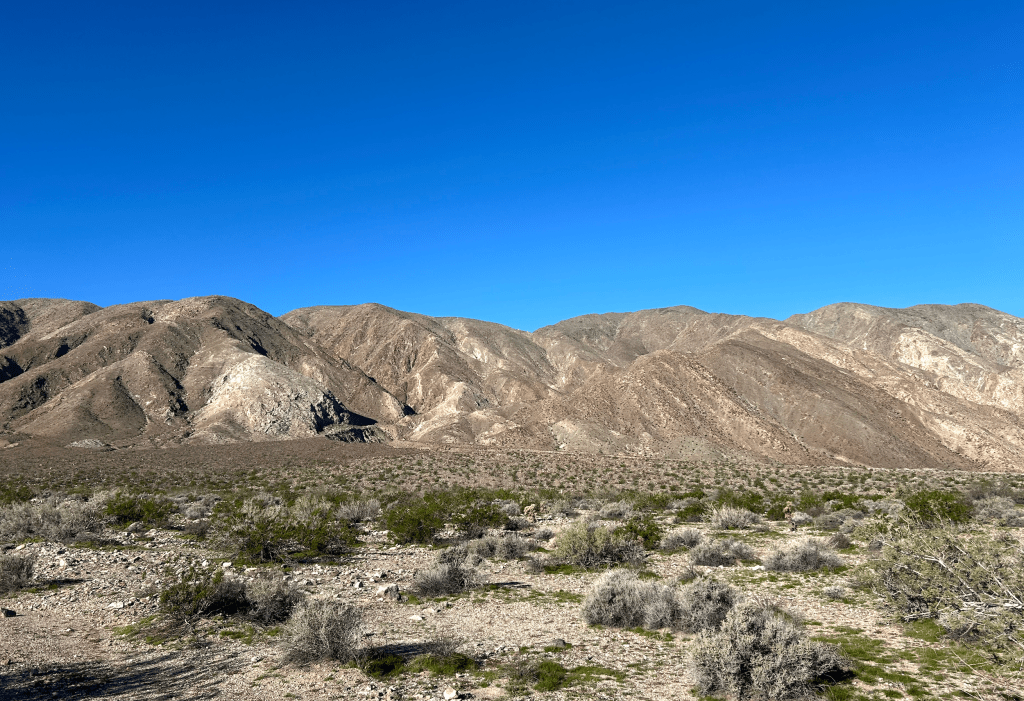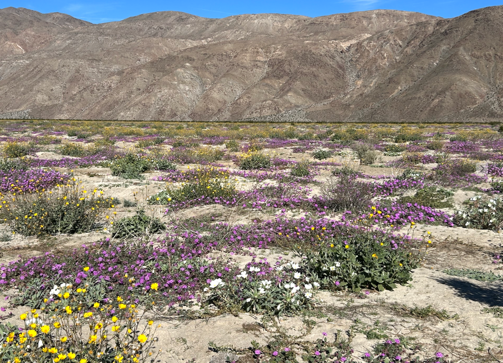 We are just finishing two weeks in another amazing and unique desert environment — the 600,000-acre Anza Borrego Desert State Park, 1.5 hours south of Palm Springs and two hours East of San Diego. It is bounded by multiple high mountain ranges.