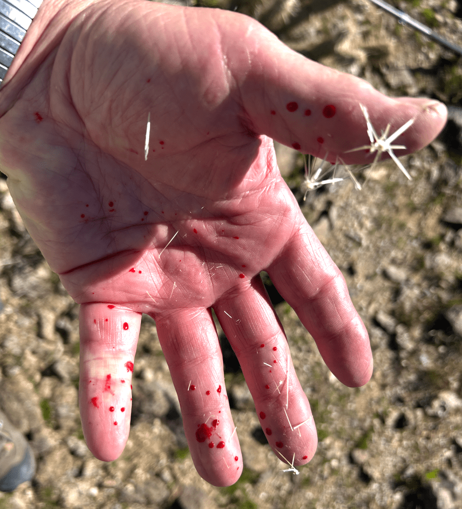 This run-in led to a collection of 20-30 “barbed stems” embedded in my left hand. It happened fast – one of the “pads” got stuck on my right ankle above my boot. The stings are really nasty and felt all the world like I had stepped on a yellow jacket nest. I instinctively swept down with my left hand to swat them away (I have a bit of an allergy to bee stings that I must pay attention to, so the swell of panic was instantaneous). This, of course, resulted in me bringing back up a wad of cholla spines in the palm of my hand. Fortunately, I had procured a good pair of tweezers as part of my hiking equipment, which I used to extract them. It took about 20 minutes and was, of course, painful! The spines have barbs (think miniature porcupine quills) that make them hard to pull out. A bunch broke off and as a result, I was pulling remnants out for a few days.