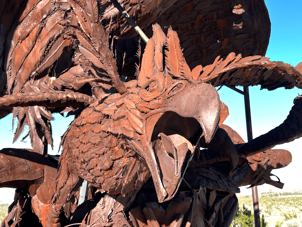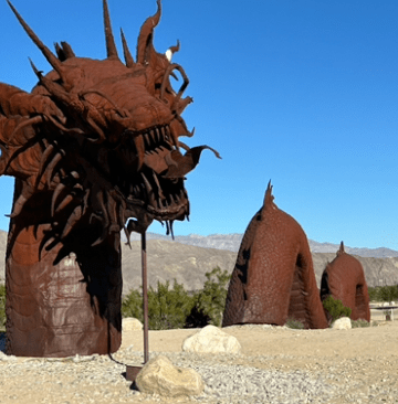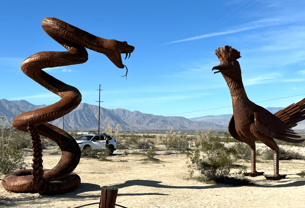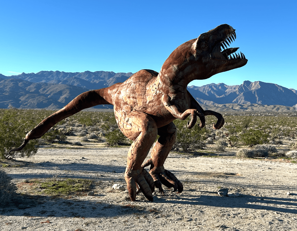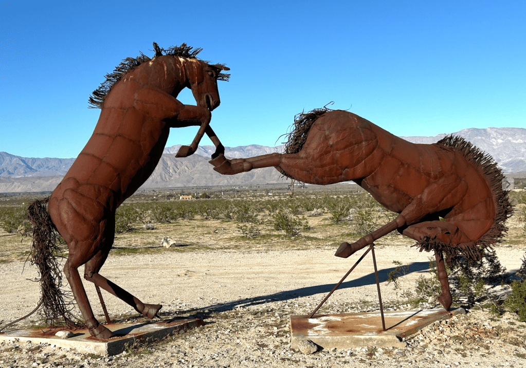 Borrego is also home to a fascinating collection of Sky Art, a collection of 130 large-scale, free-standing, metal sculptures produced by artist Ricardo Breceda. The collection was the inspiration of Dennis Avery, the late landowner of Galleta Meadows and a long-time resident of Borrego Springs. The sculptures are spread over more than 1,500 acres of land and are all accessible by car. We, of course, toured as many as we could find! Some fun pictures are below. The serpent, tyrannosaurus and horses were our favorite. Their rusted metal exteriors make them look like they definitely belong in the desert.