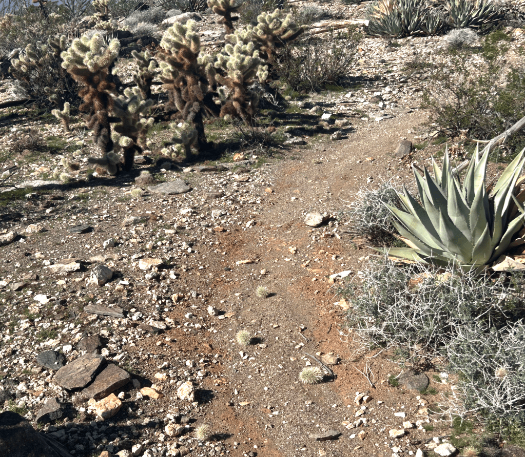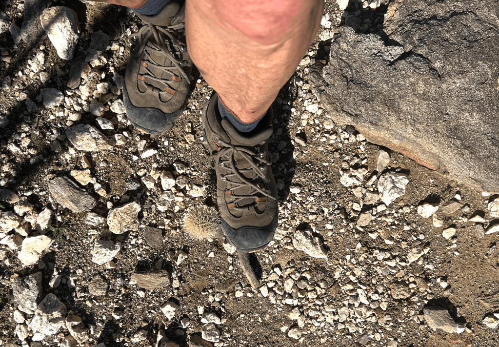 I thought the mistake I had made was that I brushed against a cholla plant next to the trail. I was miffed by this because I pay very close attention to avoiding them and couldn’t remember getting close enough to get spiked. Going up Villager, I figured out that this wasn’t the source of the problem. Instead, the problem was that the cholla drop their “pads” into the middle of the trail. I had stepped on one, which stuck to the inside of my boot (that can pierce the plastic and leather with ease!) and then brushed against my other leg.