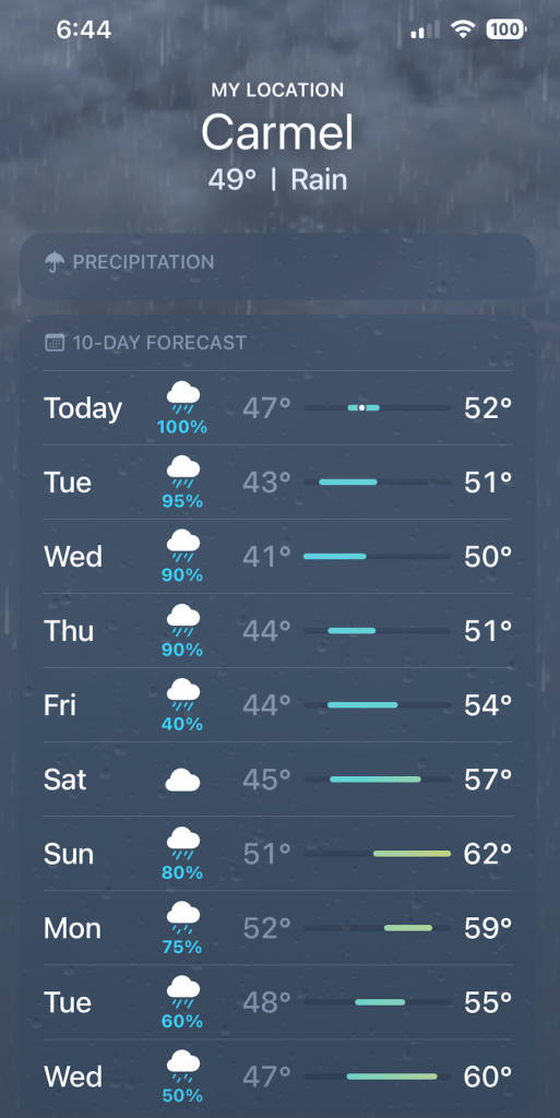 Then the rain came. Driving rain, complete with lightning and thunder, high winds, flood warnings and even some hail. Temperatures dropped to the low 40s at night and low 50s during the day.