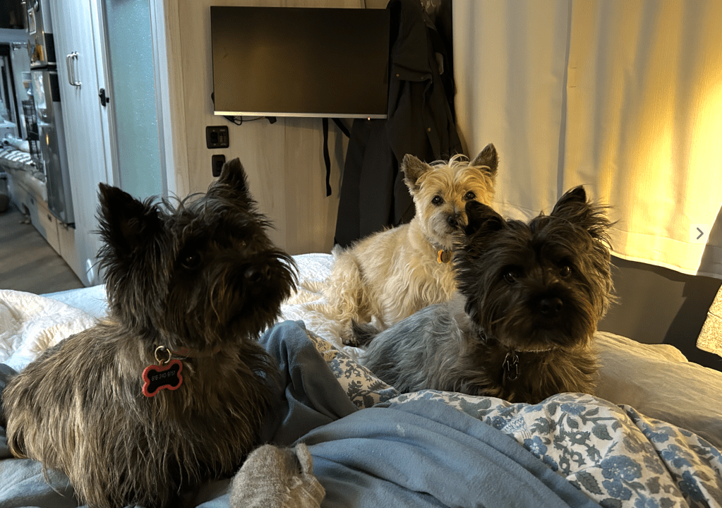 And then there is the dog management. Three wet dogs makes the trailer feel even smaller. We dry them with towels when they come inside after their potty walks, but they are still wet. (We contemplated trying out the hair dryer on them but were sure that would not settle well with them.) So you get used to the smell of damp dogs (“eaux de chien”) on all the surfaces the dogs hang out on, including our bed. There are no dehumidifiers to take the moisture out of the trailer so you just live with it, knowing eventually it will get warm and sunny again.