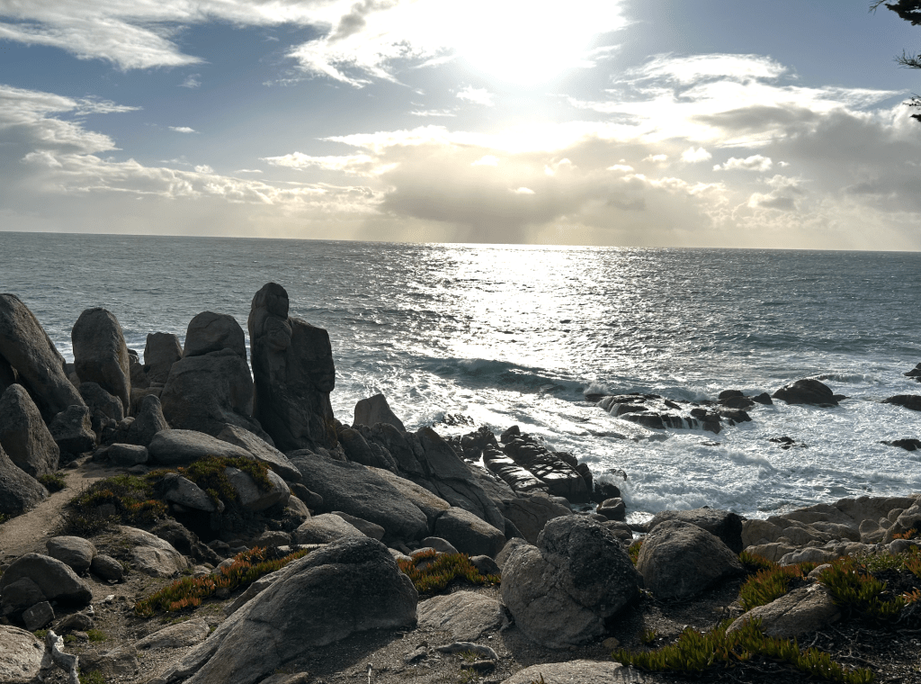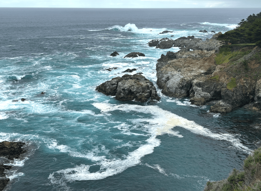 The serious rain in Carmel lasted six days. Then the sun came out. My, did it feel glorious! We took a delightful drive around the Monterey Peninsula on the 17 Mile Drive – home of the world-famous Pebble Beach golf course (where, BTW, the average home price seems to be in the $10 million range…). The post-storm winds were still whipping the ocean into a frenzy, and the clouds were creating “stairway to heaven” light visuals. What a treat!
