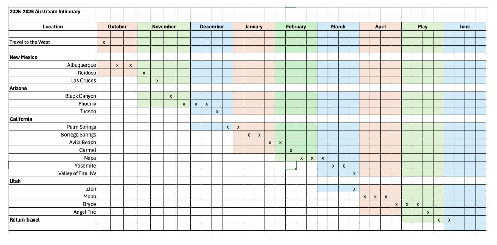 We are heading out on Tuesday, October 14. Our first five days will be 2300 miles taking us through New York, Ohio, Missouri, Oklahoma, Texas and finally to Albuquerque New Mexico. We doubt there will be much to post about until we get to New Mexico, which is new territory for us. See you all…
